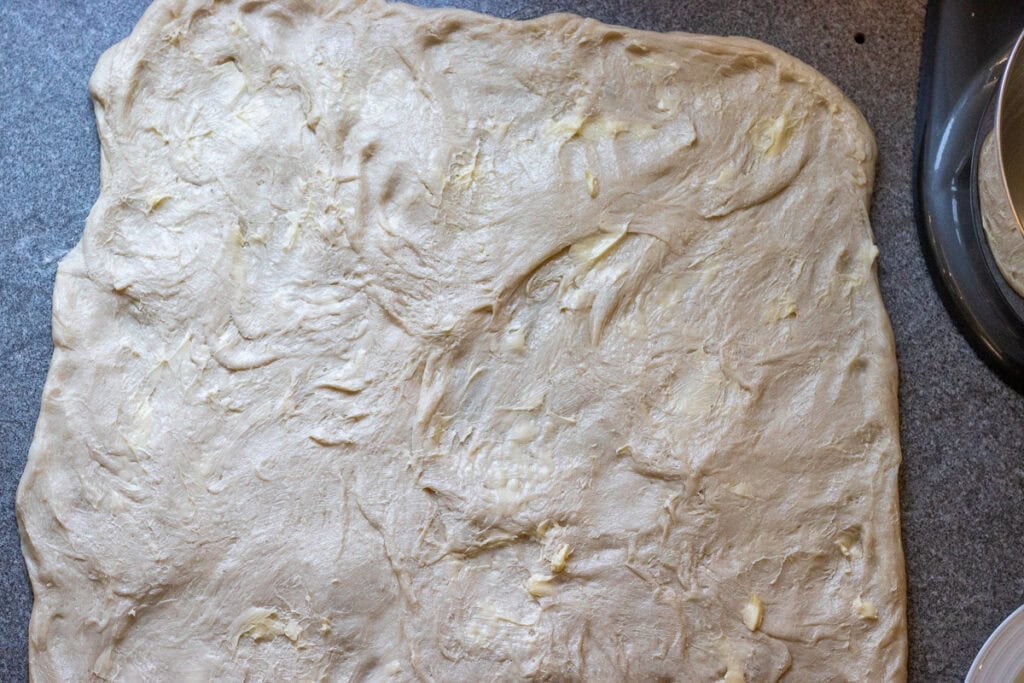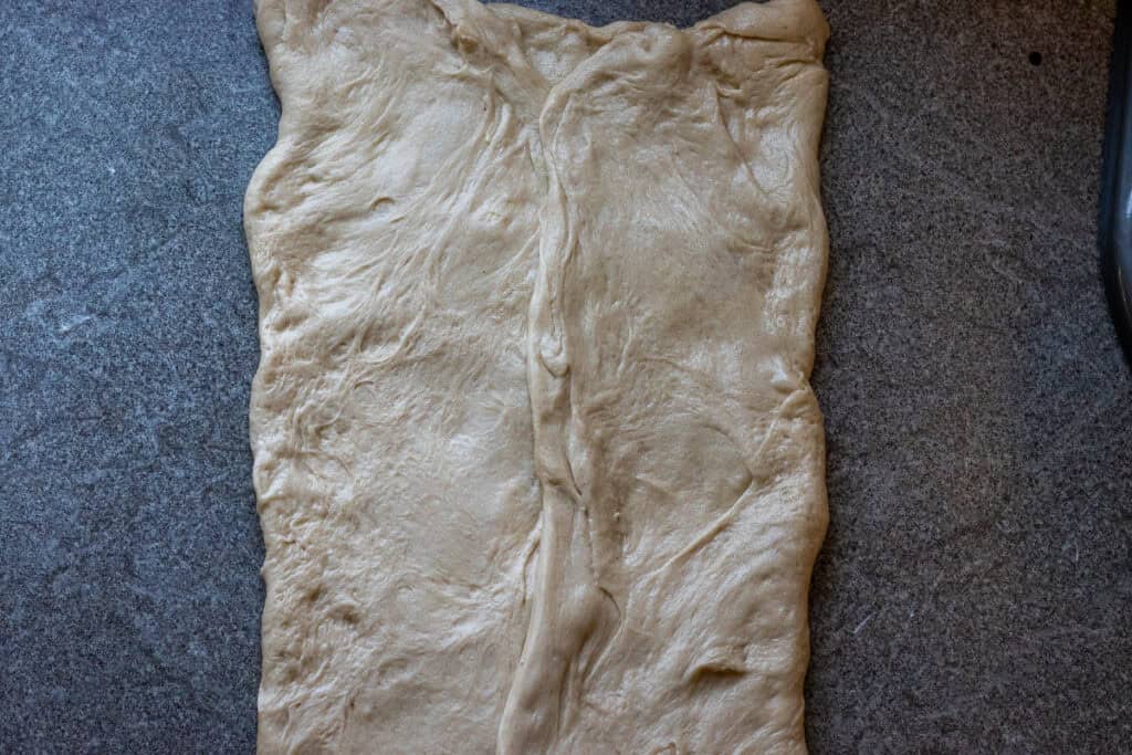 - Next, press down gently on the dough to shape it into a rectangular shape to a size of 10" x 17" (27 cm x 44cm).