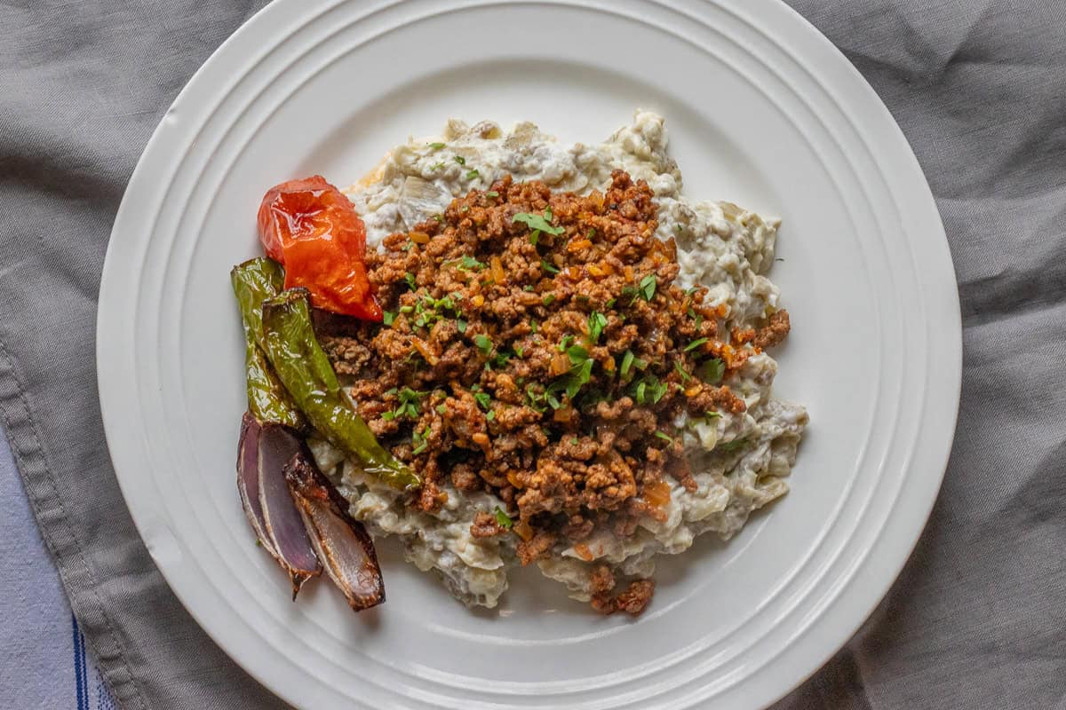 - Yogurt - You can use both thick strained Turkish yogurt or Greek yogurt. Mix with the puréed eggplant to create the base for the cooked lamb mince.
