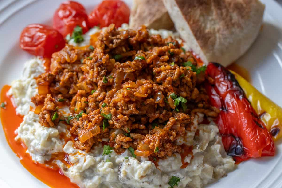 Alinazik Kebab is typically served alongside Turkish Rice (Sehriyeli Pilav) or Pita Bread. Other types of bread such as Bazlama (Turkish Flatbread) or Tawa Naan with Garlic are also great for pairing with this kebab dish.