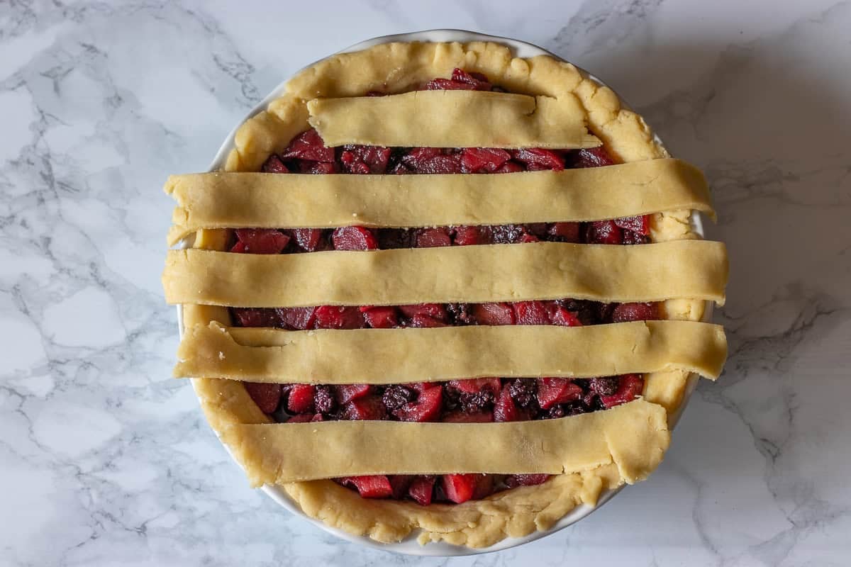 - Thread the strips over and under one another, pulling back strips as necessary to weave. Use the shorter strips for the edges and the longer ones for the middle of the pie. Trim each strip comes to the edge of the pie.