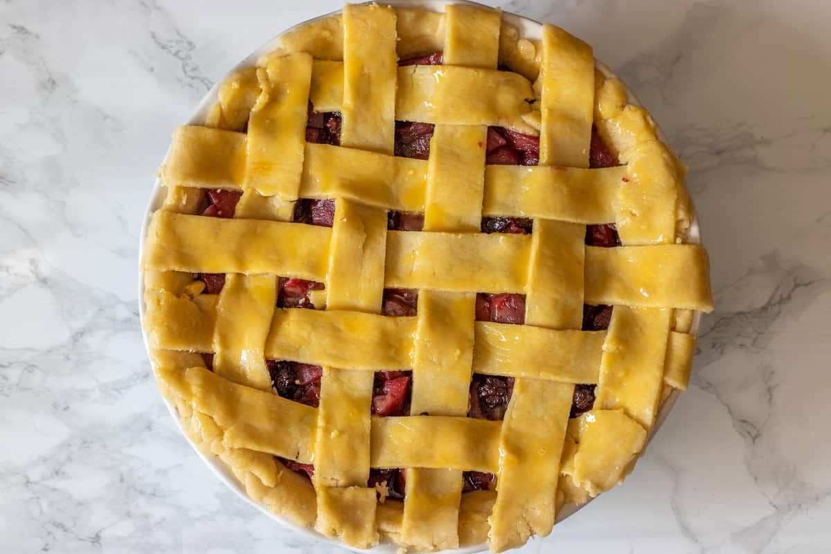 Crimp or pinch the outer edge to seal the top and bottom crusts together. Egg wash the lattice top with the egg yolk using a brush.