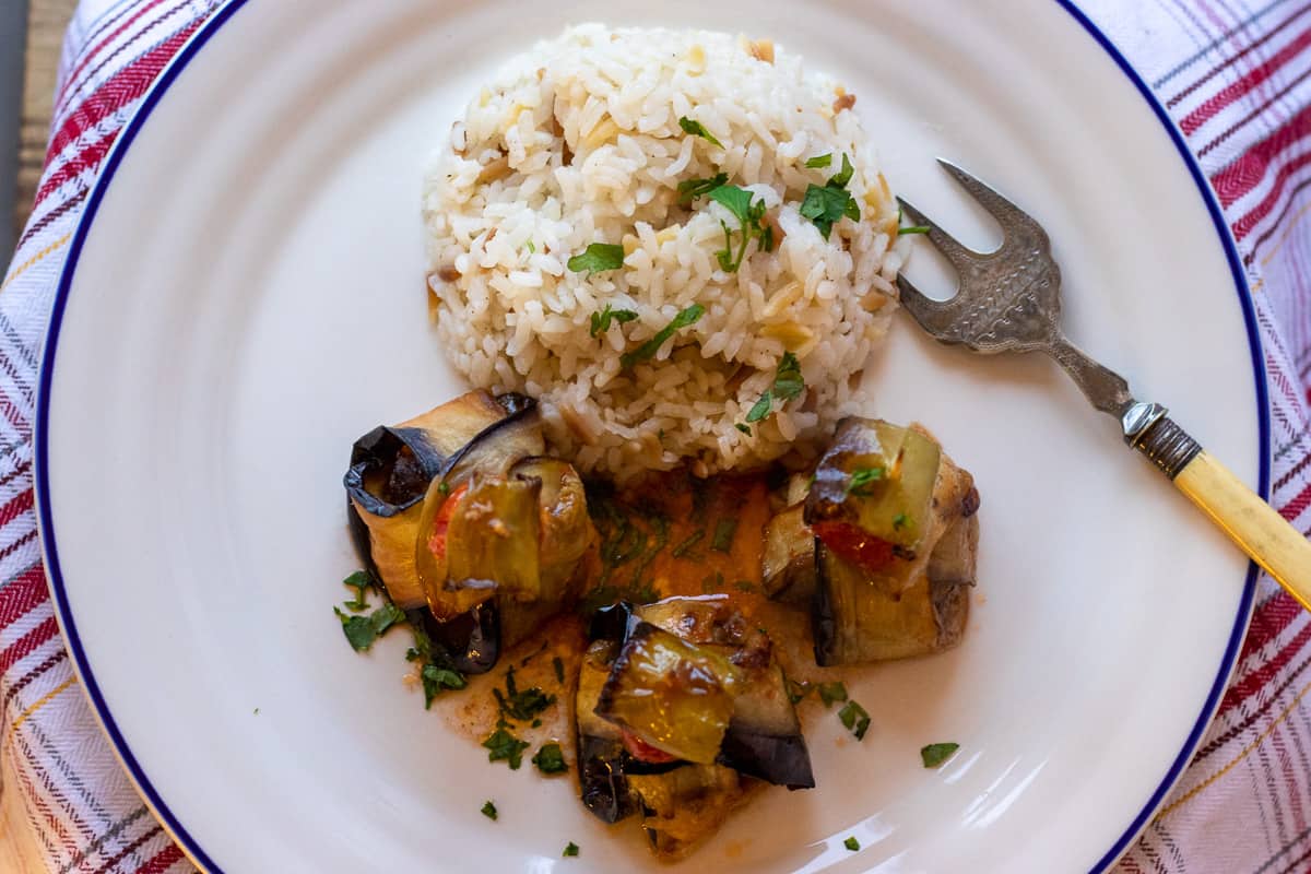 Aubergine Meatball Wraps (Islim Kebabi or Kurdan Kebabi) are one of those traditional Turkish dishes mainly known and loved by regular households in Turkey. It is not a landmark dish that widely represents Turkish cuisine abroad, such as the Turkish Chicken Shish Kebab or Lamb Shish Kebab.