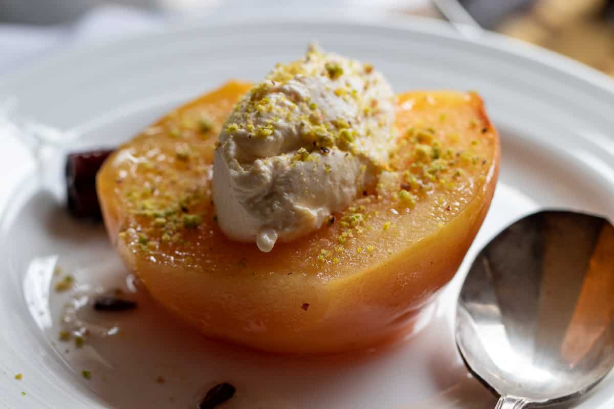 Ayva Tatlisi is a traditional Turkish dessert that is made from quince fruit. The fruit is peeled, cored, and poached in a simple sugar syrup until it becomes tender and has absorbed the flavor of the syrup.