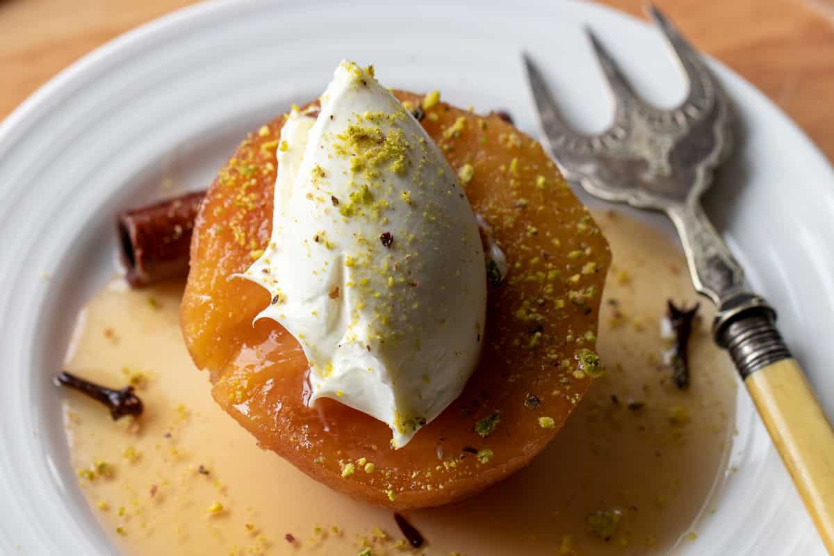 Turkish Poached Quince, or Ayva Tatlisi, is a delicious dessert that uses the natural, delicate, and aromatic flavors of quince fruit, which blend beautifully with cinnamon and cloves.