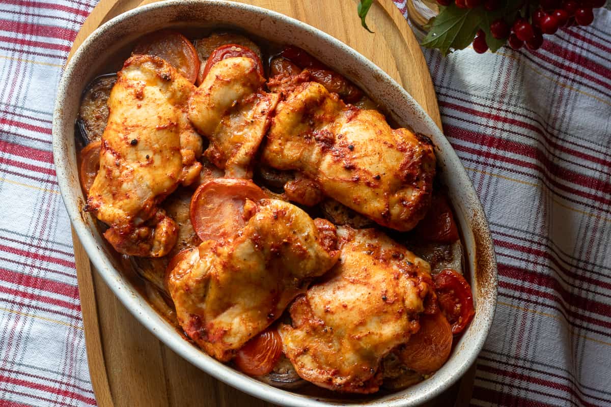 The perfectly cooked, juicy, and crispy chicken thighs and delicious Mediterranean vegetables in this one-pan roasted dish are satisfying every time! This oven-baked chicken dish is perfect for a meal prep that you will find yourself making regularly.