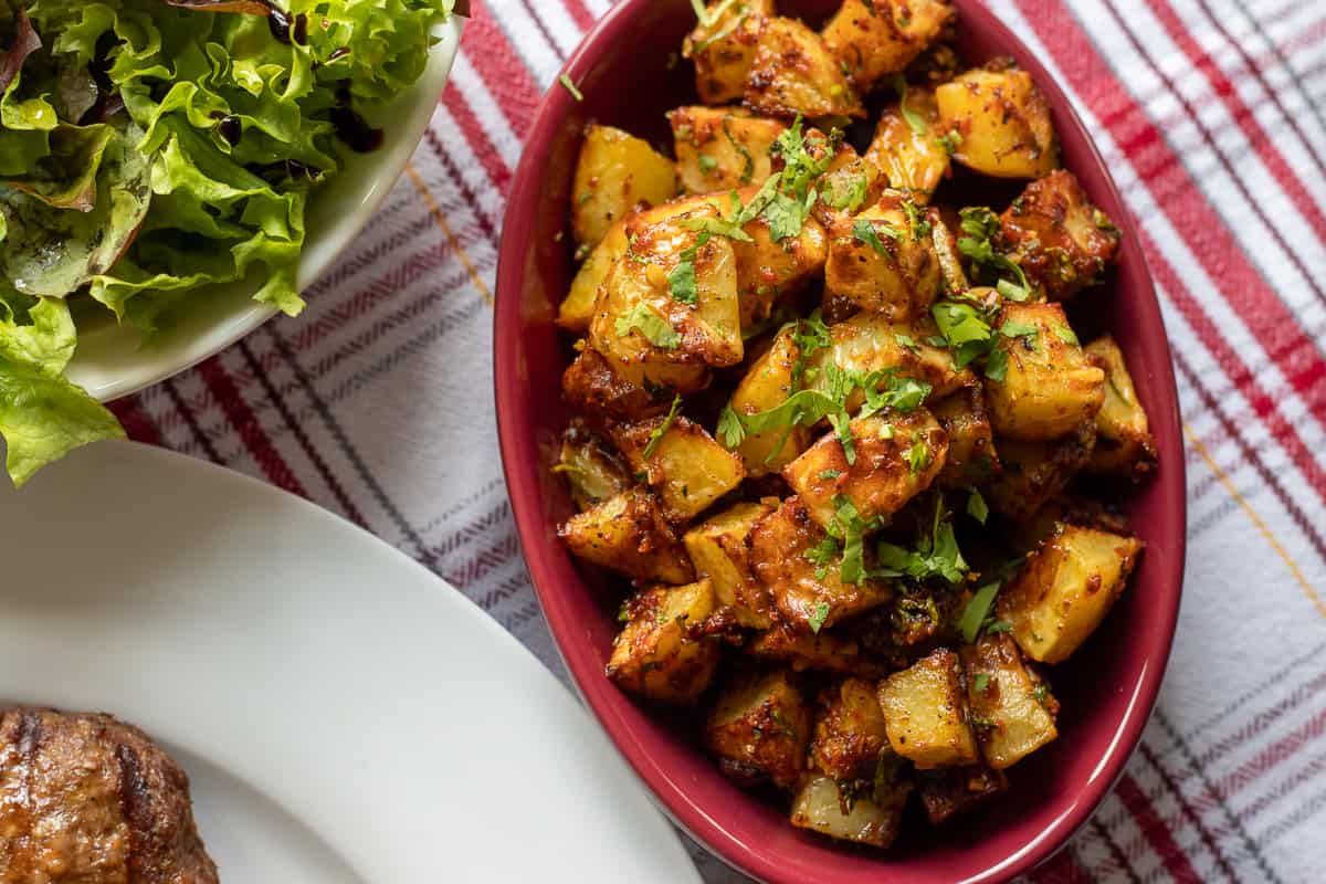 In this version, the cubed and seasoned potatoes are air-fried until they are crispy and tender. The spiced herb sauce is then added to the potatoes and mixed until well-coated.