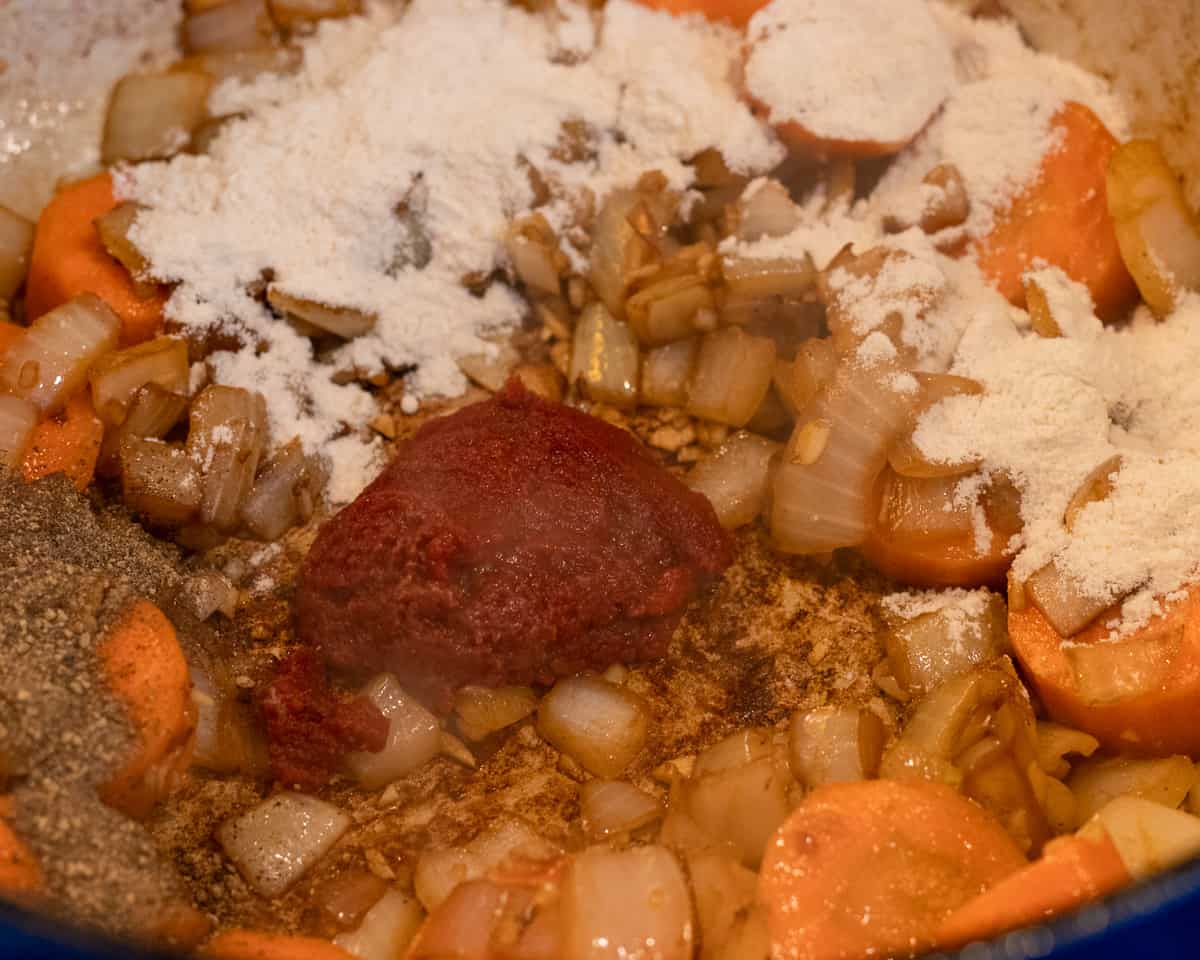 - Gently brown the vegetables for 5 minutes, and stir in the flour along with the tomato paste and black pepper.
