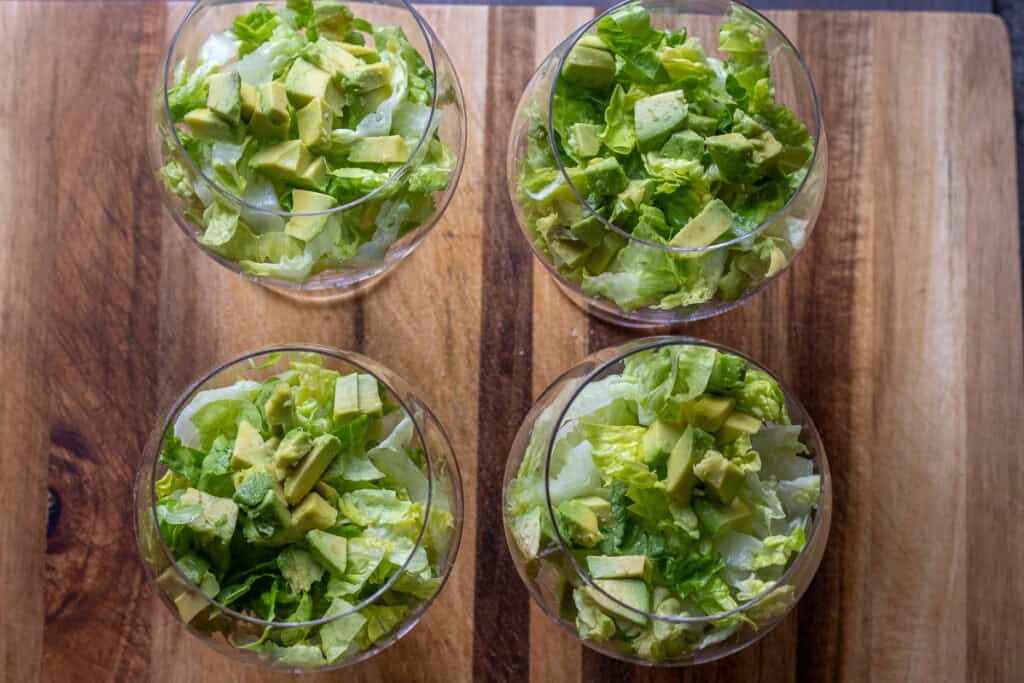 - Arrange the shrimp neatly on top of the greens. Spoon the cocktail sauce left in the bowl over the shrimp and avocado.