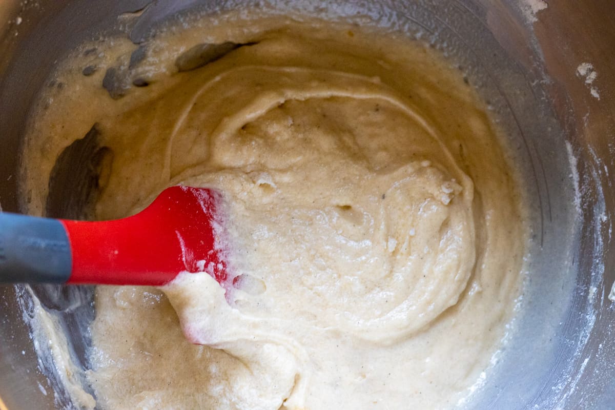 At this stage, either switch to a hand whisker or silicone spatula.