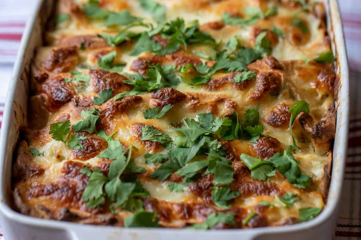 The white sauce adds a creamy and luxurious texture to this white Chicken Enchilada casserole dish, making it a crowd-pleaser.