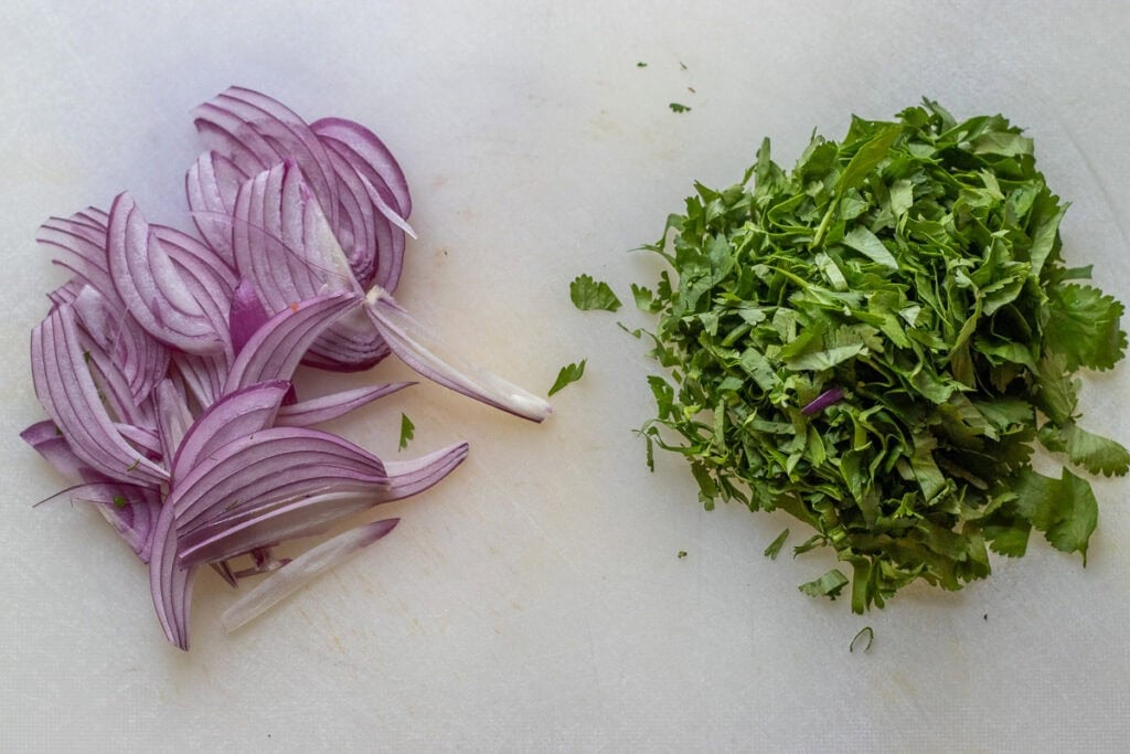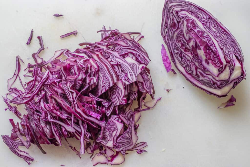 Start by shredding the cabbage, red onions, and carrots. You can use a sharp knife, a mandoline slicer, or a food processor to get thin, even slices.