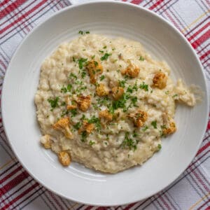 This roasted cauliflower risotto has a rich, creamy, and slightly runny texture. The addition of the cauliflower puree into the risotto gives it an extra creamy texture without using lots of cream. It also enhances the flavor.