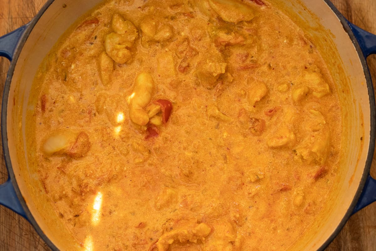 Add 30 ml of double cream (heavy cream) to the pan, and stir gently to incorporate it into the curry.