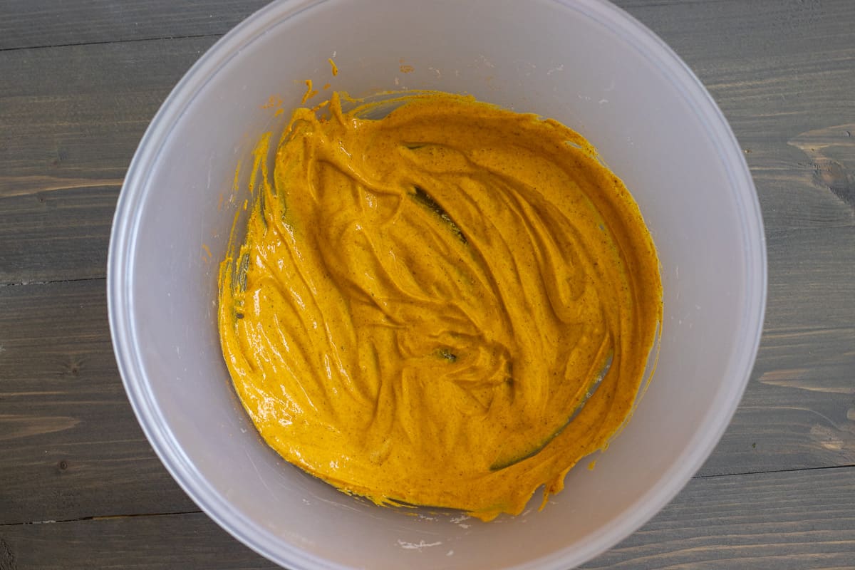 - In a mixing bowl, combine 2 tablespoons of plain natural yogurt, 1 teaspoon of turmeric, ½ teaspoon of garam masala, and ½ teaspoon of salt. Mix well.
