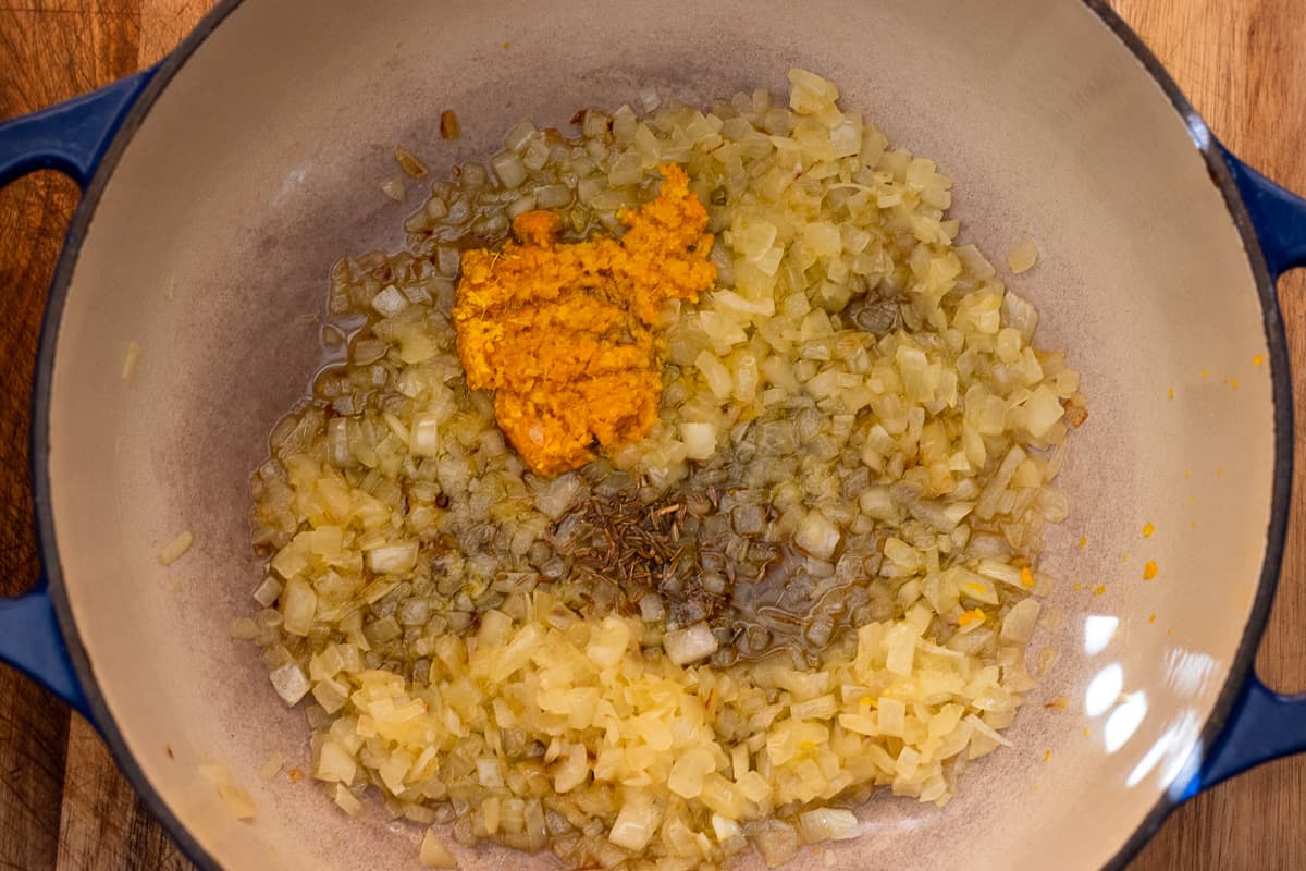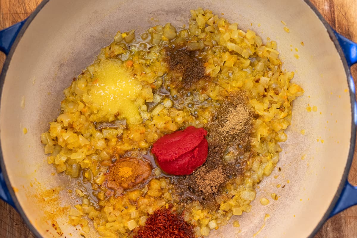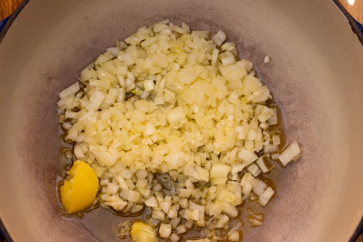 In a Dutch oven or a heavy-based pan, melt 2 tablespoons of ghee over medium heat. Add 2 medium diced onions and sauté until golden brown.