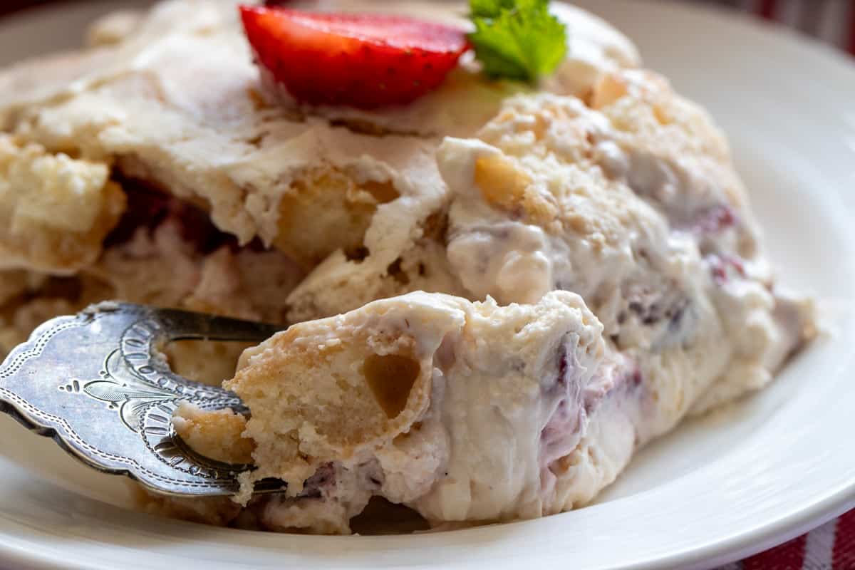 - Combine the stiffened egg whites and ¾ of chopped strawberries with the mascarpone mixture. Use a silicone spatula to gently fold the ingredients from the bottom to the top.