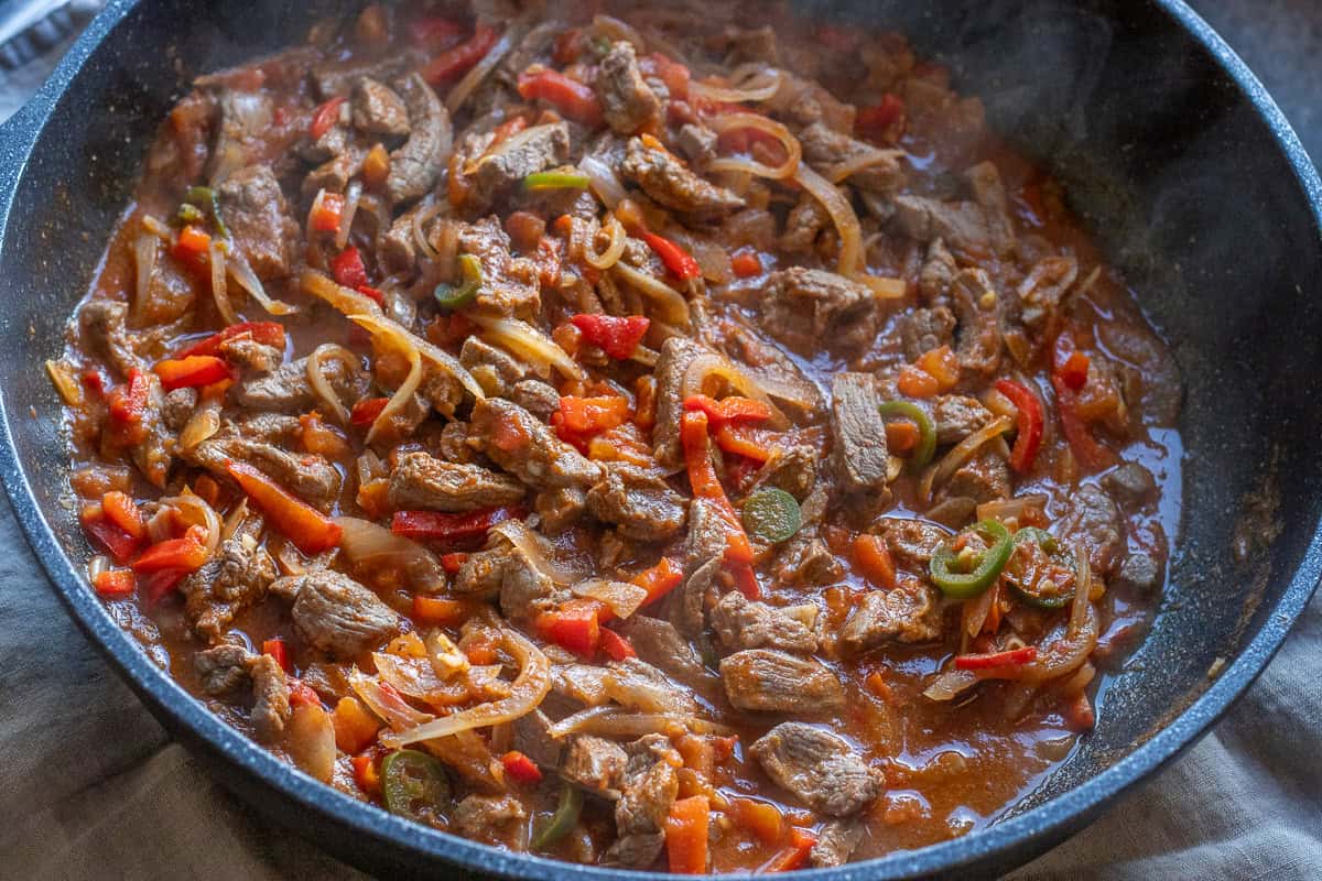 - Stir well, add the water, cover the pan with a lid and then cook it on medium heat for 10 minutes, until the beef strips are thoroughly cooked.