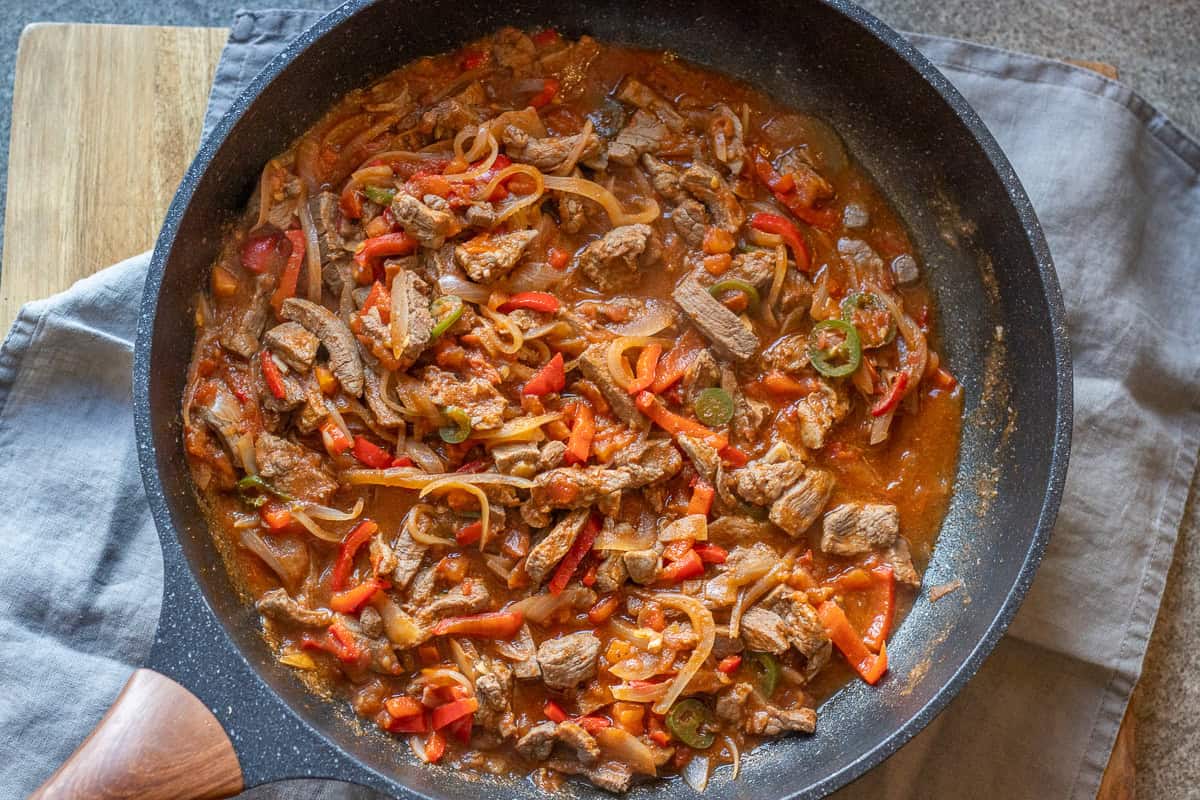 Cover the pan with a lid and then cook it on medium heat for 10 minutes, until the beef strips are thoroughly cooked. Serve immediately with your choice of a side dish when still warm.