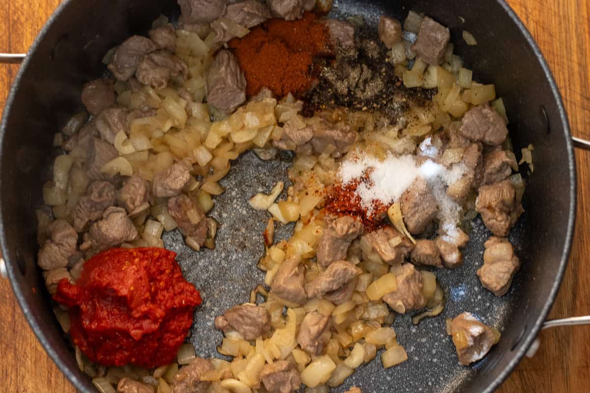 - Add the tomato paste, salt, pepper, chili flakes, paprika to the pot and stir well to combine.