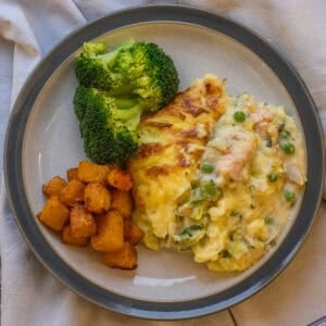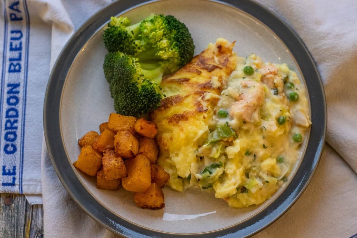 It is the ultimate British comfort food made with chunky pieces of fish, leeks, peas, and aromatic fresh herbs in a creamy white sauce, topped with fluffy and cheesy mashed potatoes.