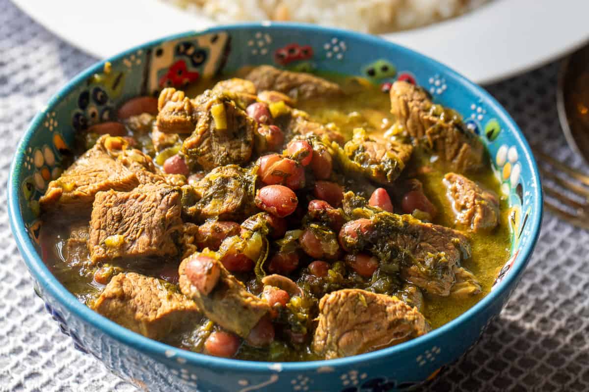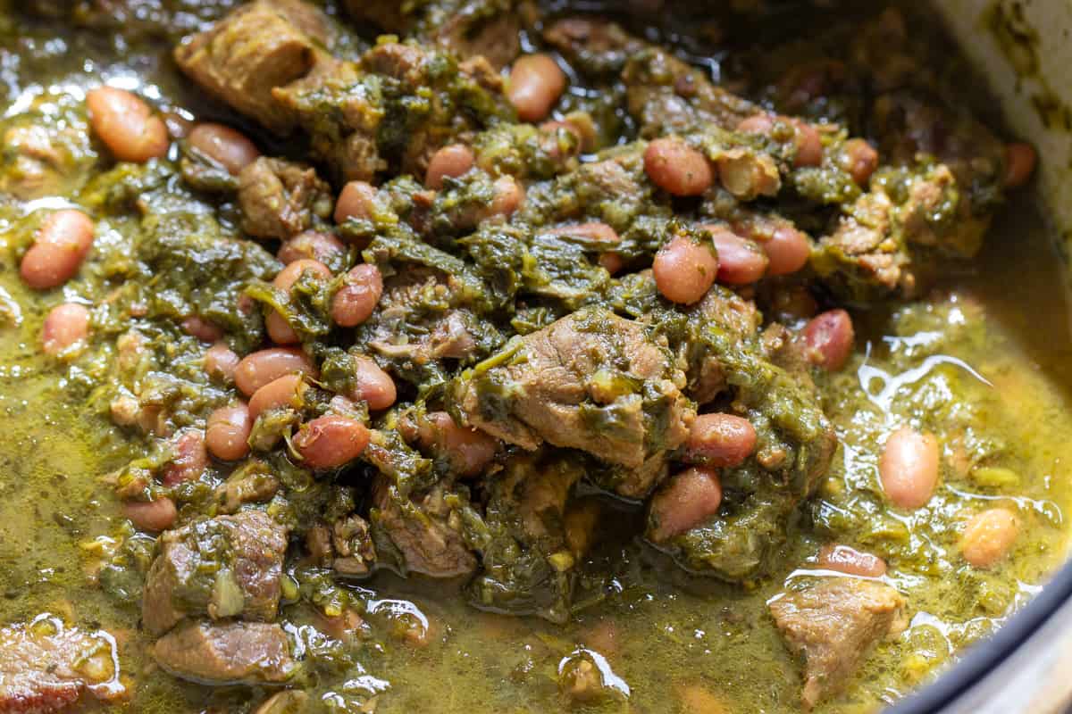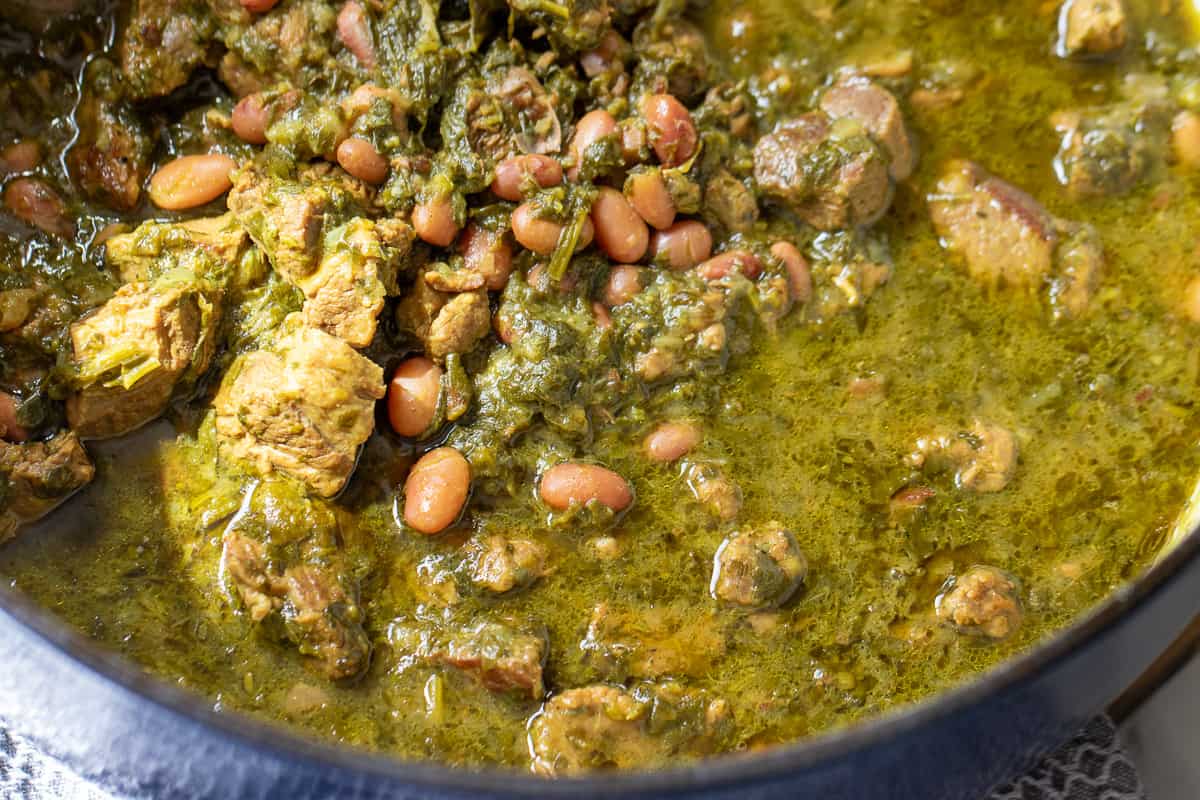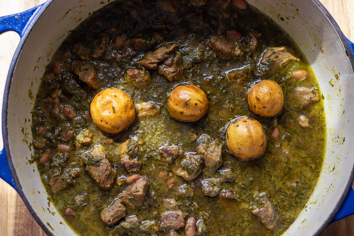 The dish typically consists of ingredients like meat (usually lamb, veal, or beef), kidney beans, a mixture of sautéed fragrant herbs (such as parsley, cilantro, green onions, and fenugreek), and dried Persian limes (a.k.a black lime or limo amani).