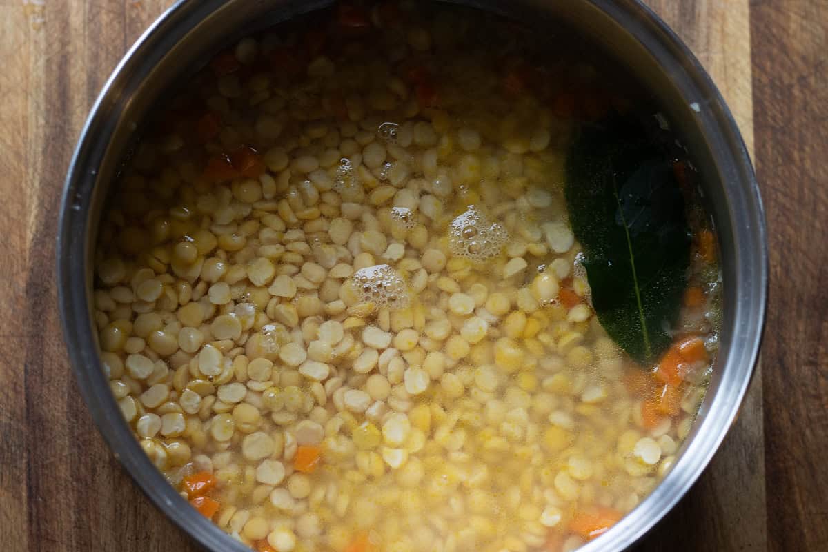 Drain the split peas and add them to the pan along with the bayleaf and 500 ml water. Make sure to cover them by about two inches.
