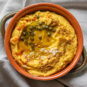 - Transfer the blended fava to a serving bowl. Drizzle with a tablespoon of olive oil and garnish with capers and finely chopped red onions or shallots. Sprinkle on paprika or cumin to add colour and warmth.