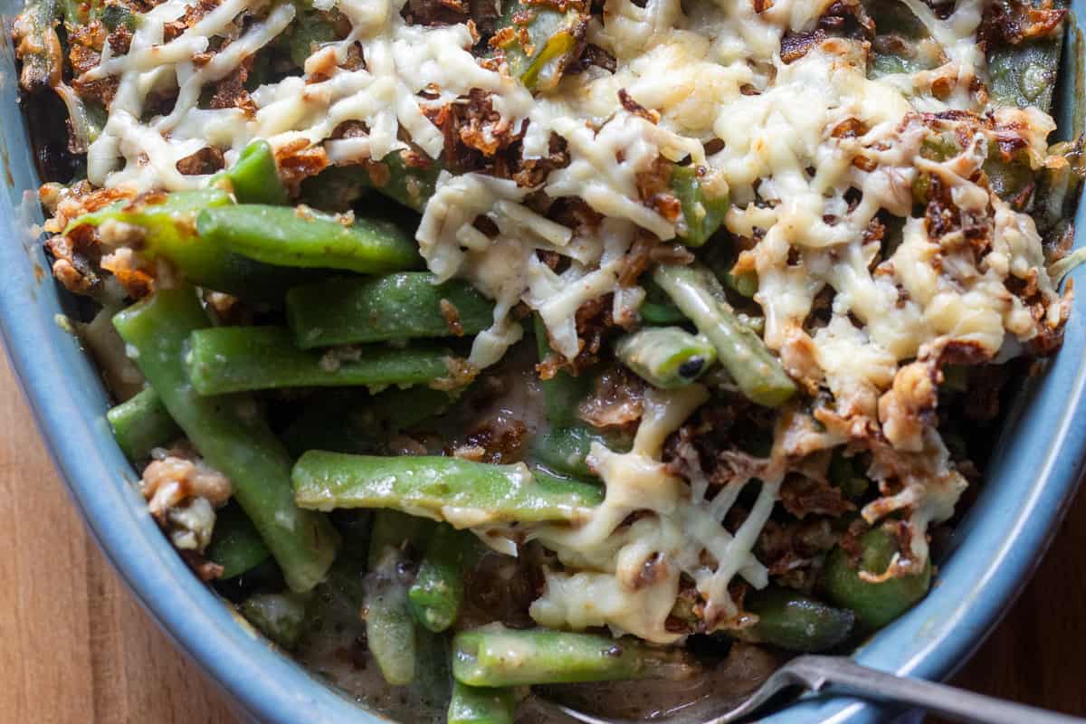 - Place the green beans in a baking dish or casserole, sprinkle the remaining fried onions evenly over the top of the beans, and then scatter the grated cheese on top of the fried onions.