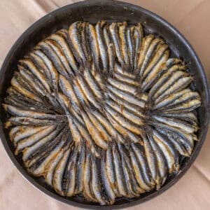 - Heat the oil in a large frying pan over medium-high heat. Once the oil is hot, arrange the anchovies in a circular pattern, making sure they are tightly touching each other.