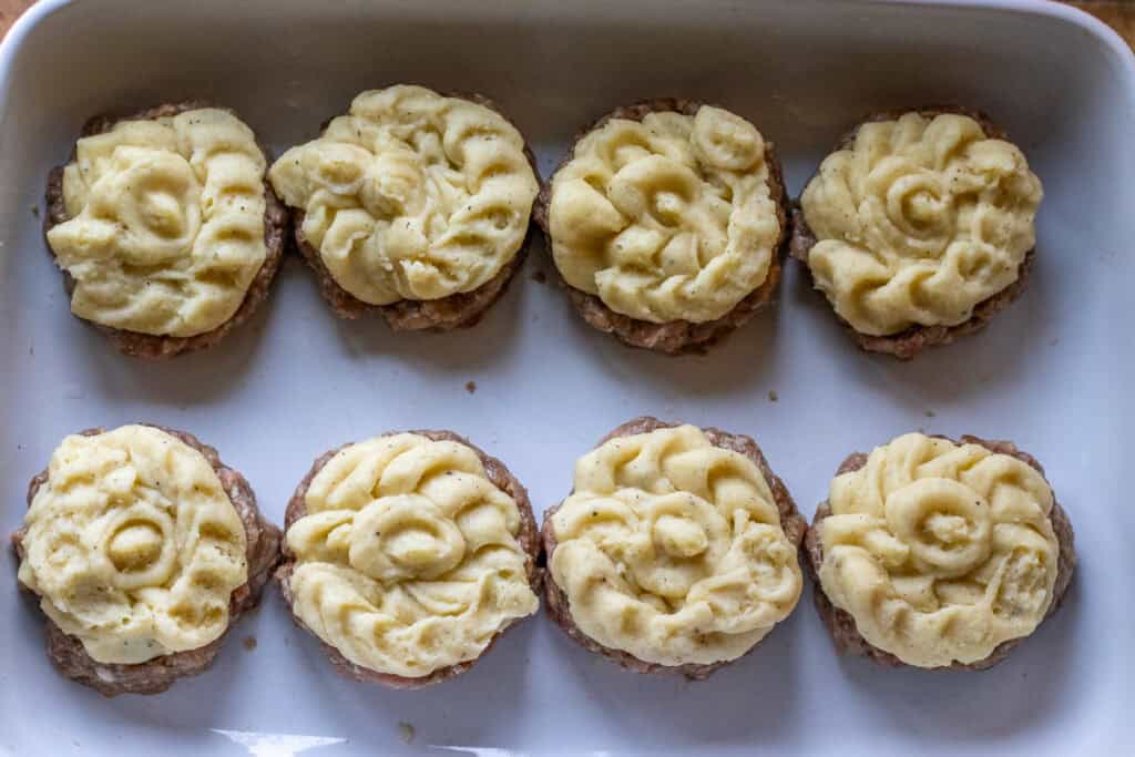 - Fill the holes with 1 ½ tablespoons of peas and then top with mashed potatoes using a spoon or a piping bag.