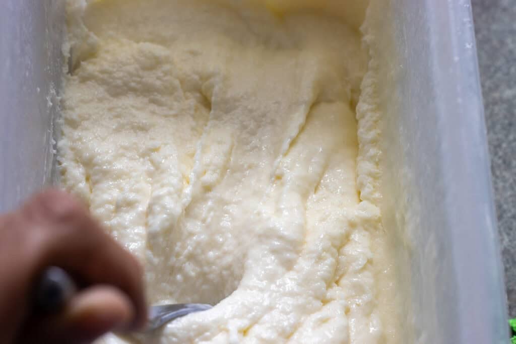 - Place the container in the freezer. Every 30 minutes, take it out and stir vigorously with a whisk or a spoon. Scrape any ice crystals that form on the bowl. This helps in incorporating air and breaking down ice crystals, ensuring a smooth texture.