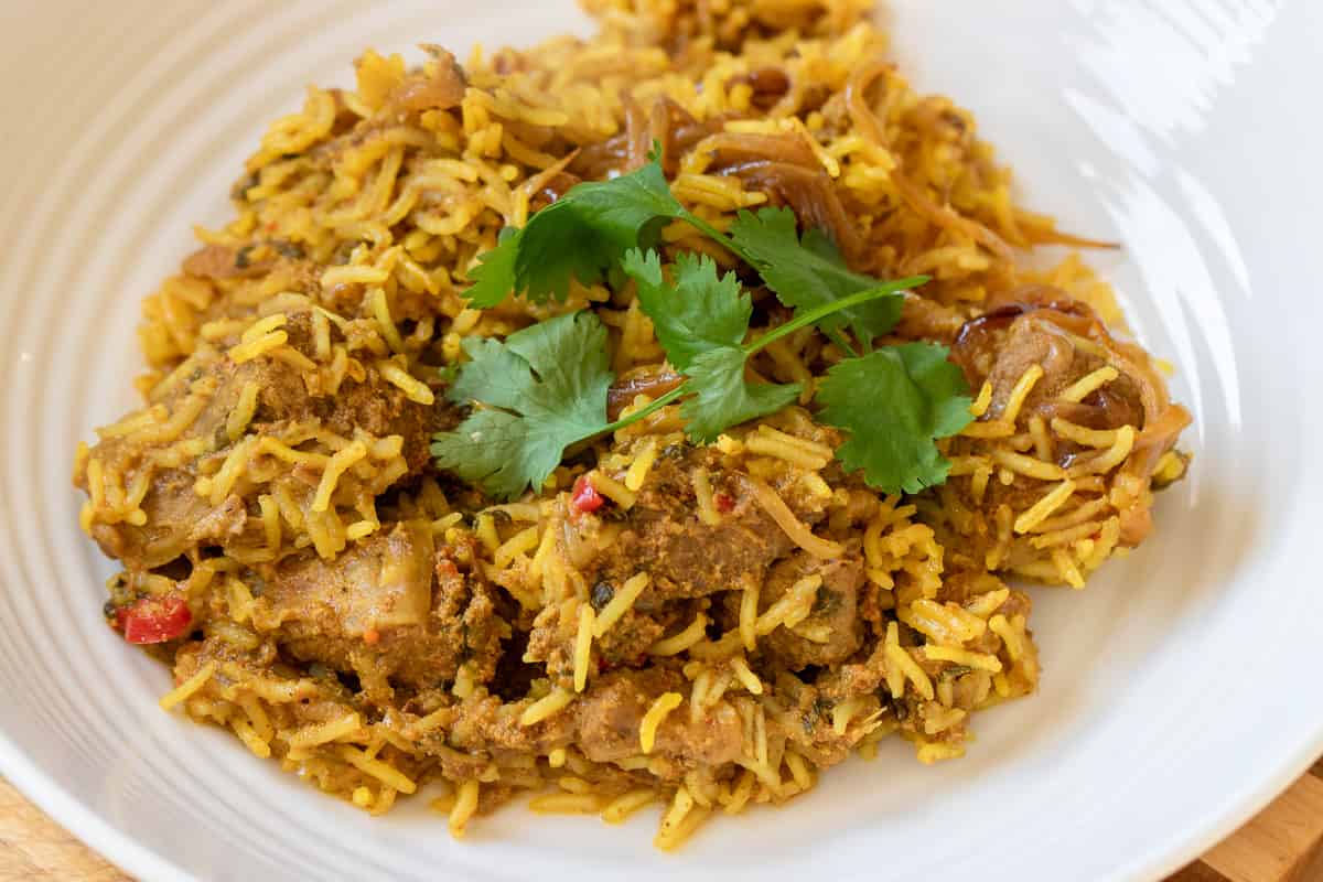 Biryani is a classic South Asian rice & meat dish made with perfectly cooked, fluffy grains of fragrant basmati rice, exotic spices, caramelized onions, and tender chunks of marinated lamb, chicken, or mixed vegetables.