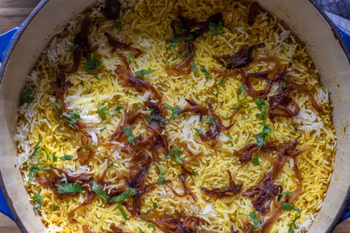 In a Pakki (Cooked) Biryani, the basmati rice, marinated meat, and fried onions are partially cooked separately, before being layered in a heavy-based pan (or a Dutch oven). After the layering, the dish is baked to complete the cooking and allow the flavors to combine.