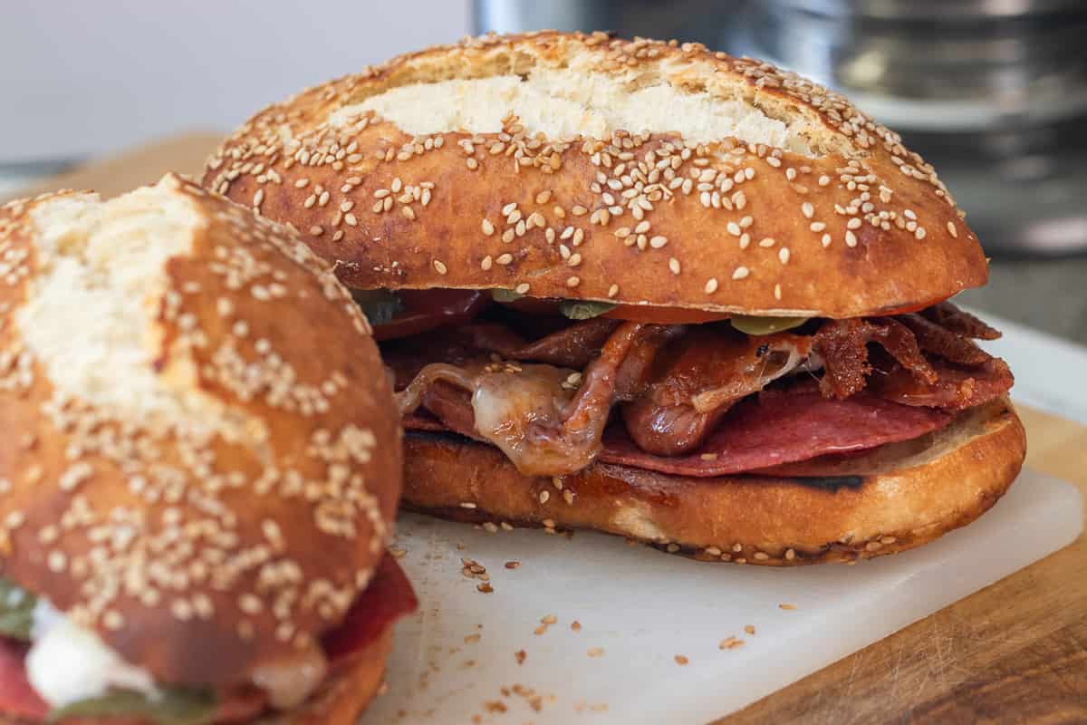 The word kumru refers to both the sandwich and the bread. Kumru bread is a dense, yet lightly crusty bread topped with sesame seeds, and hard to find outside of Izmir. As a substitute, you can modify the Simit dough into a kumru loaf shape.