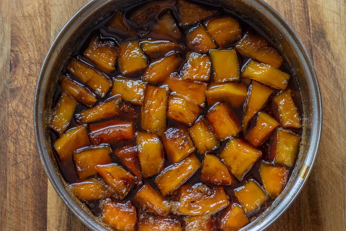 - If you want the pumpkin to hold its shape perfectly, avoid stirring too often. Instead, tilt the pan and spoon the syrup over the top from time to time.