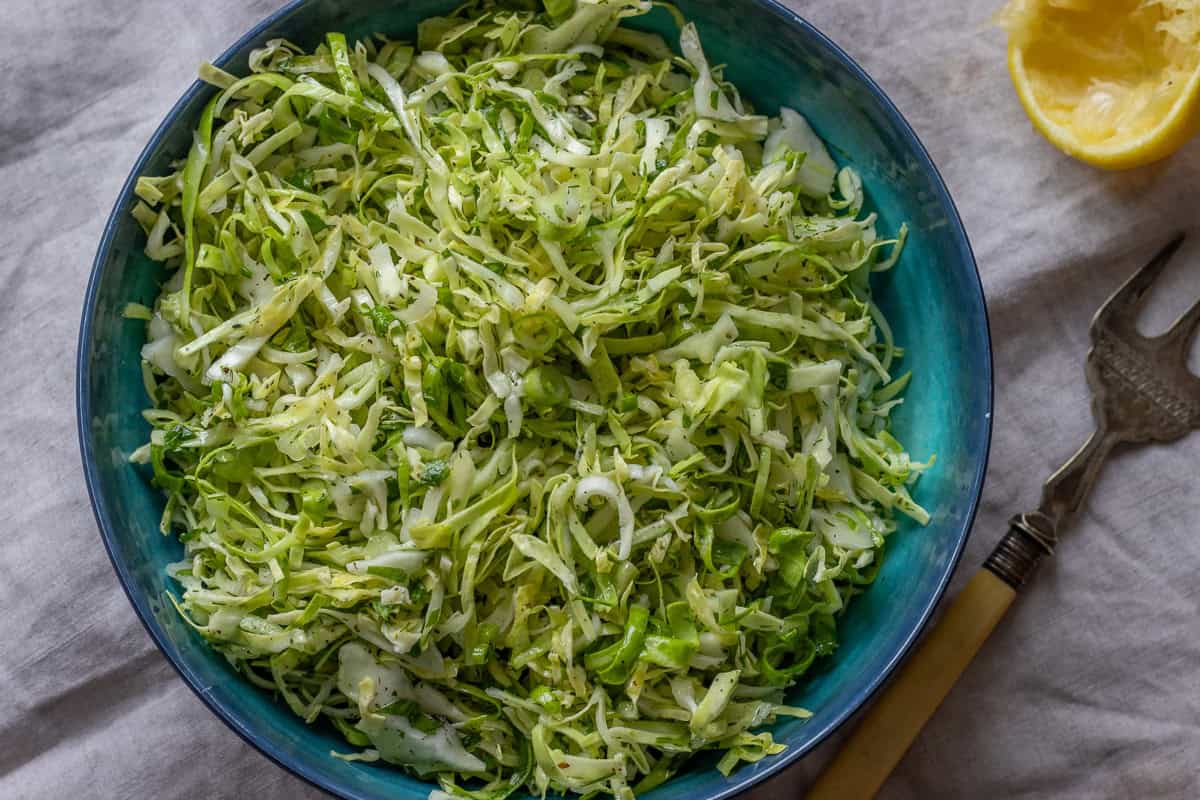 Use clean hands to toss and massage the cabbage with the dressing. This step is gentle; you are loosening the cabbage and helping it soften slightly while it soaks up the lemon and olive oil. Taste and make any final tweaks to the seasoning.