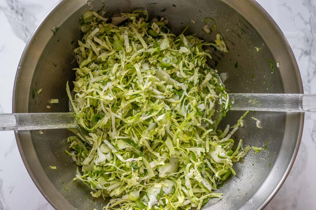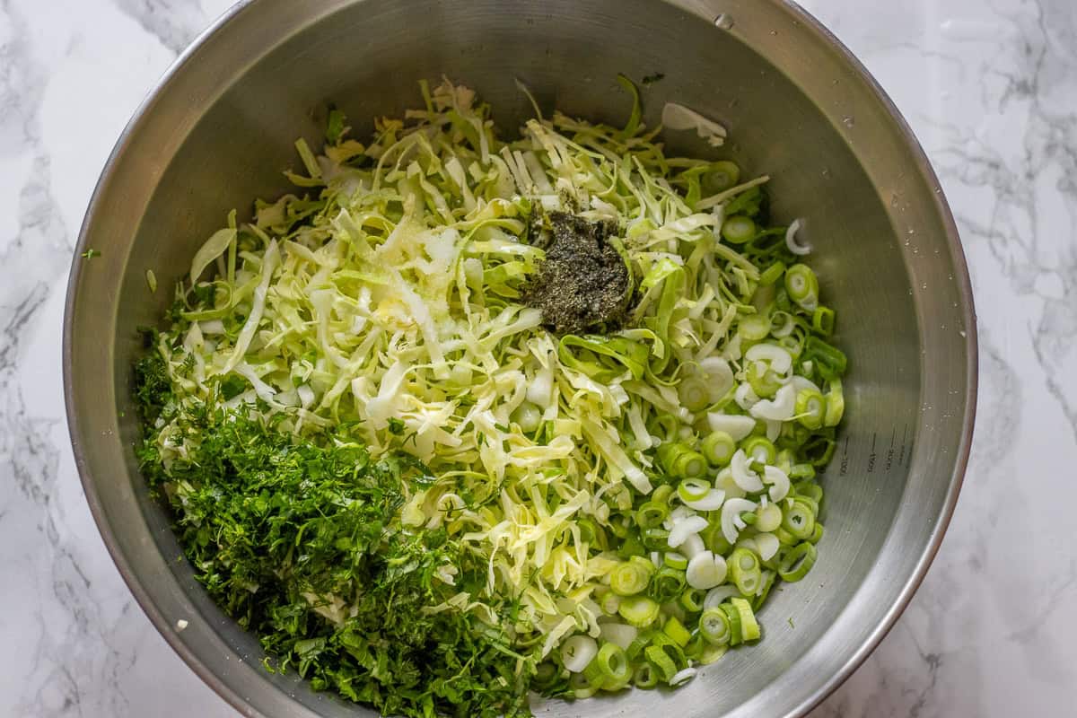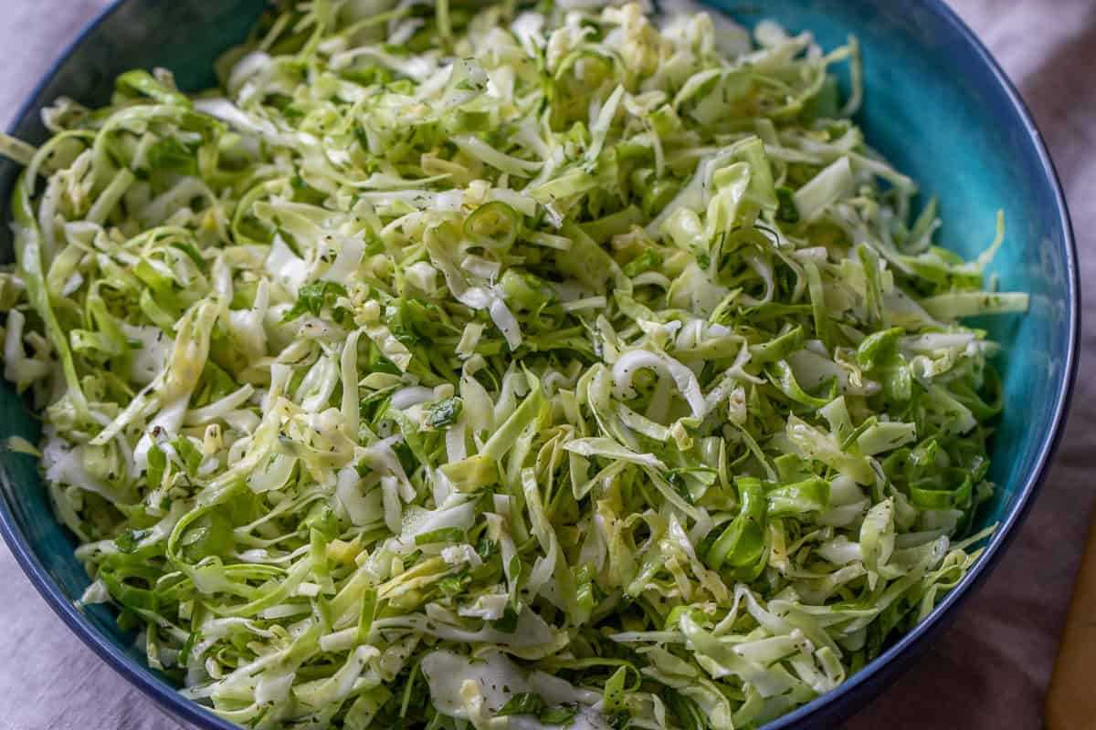 - Put the shredded cabbage into a large mixing bowl along with parsley, scallion, and dill, and pour the dressing over it.