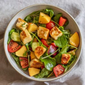 If you like fresh, vibrant salads with a mix of sweet and savory, this Mediterranean Honey Halloumi Salad is a great one to try. It’s made with pan-seared halloumi cheese, juicy peach, crisp cucumber, cherry tomatoes, and arugula, all tossed together with a sweet-sour dressing made from honey, lemon, and pomegranate molasses.