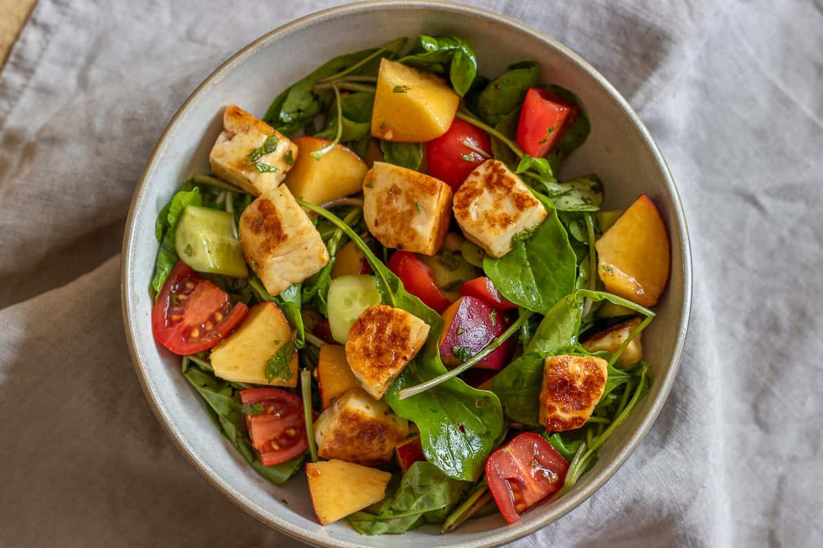 - For leftovers: store halloumi, peaches, and dressing separately from greens. Reheat halloumi/peaches gently in a pan, then toss with fresh greens when ready.