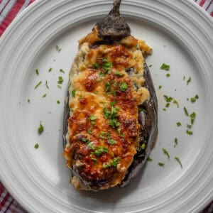Eggplant Papoutsakia (or Patlıcan Pabucaki) is a delightful vegetarian stuffed eggplant dish from Greek and Turkish cuisine. While it traditionally includes ground meat stuffing similar to Greek Moussaka (Musaka), I prefer this vegetarian version as a lighter option, especially during the summer.
