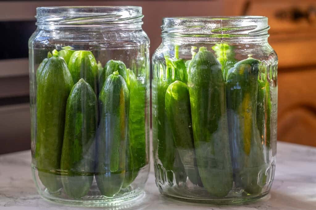 - Arrange the cucumbers tightly inside of a sterilized jar and place garlic cloves and lemon slices around the cucumbers.