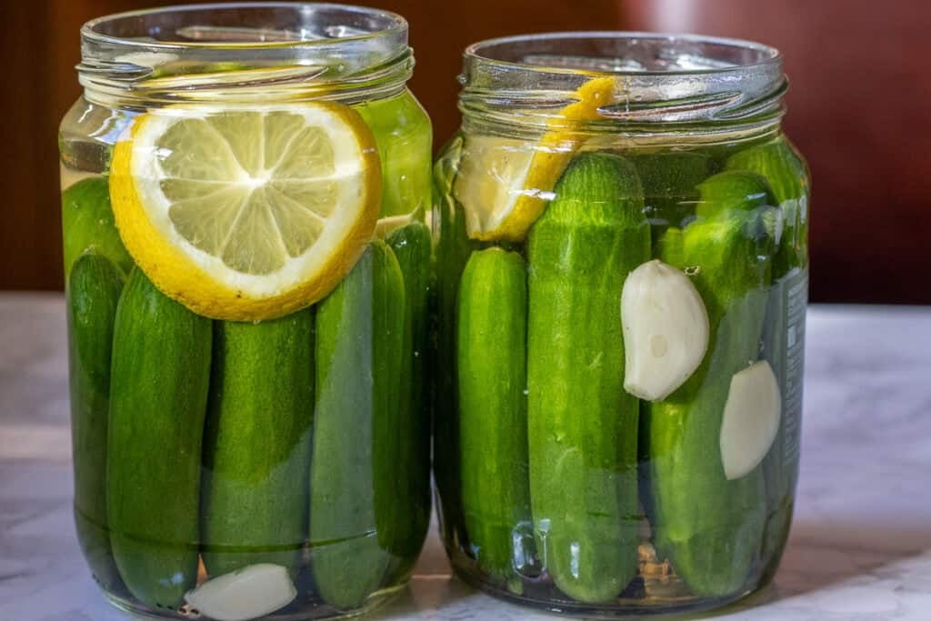 Wash the cucumbers thoroughly and trim the ends. You can poke small holes in each cucumber to help the brine penetrate faster. Arrange the cucumbers tightly inside a sterilized jar and place garlic cloves and lemon slices around the cucumbers.