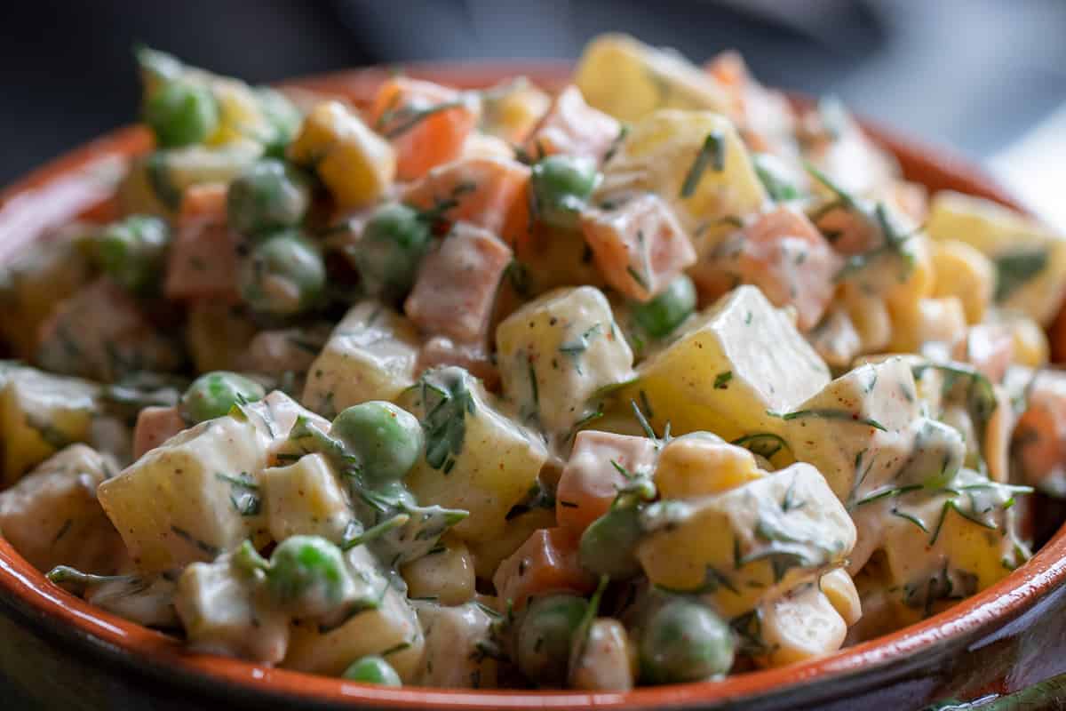 Russian Salad (Salad Olivier) is perfect on its own with a piece of Bazlama (Turkish Flatbread). You can also serve this versatile salad as a side dish with a variety of accompaniments. Here are a few suggestions for what to serve with Russian salad: