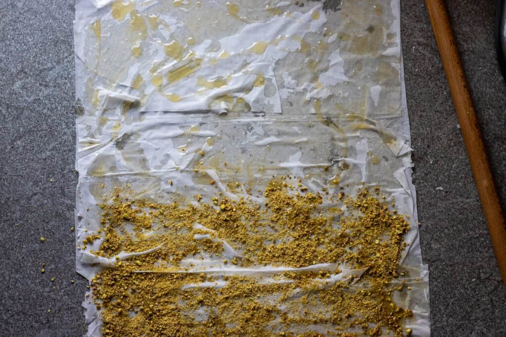 - Sprinkle on 2 tablespoons of ground pistachio over half of the buttered phyllo sheets, and spread it evenly.