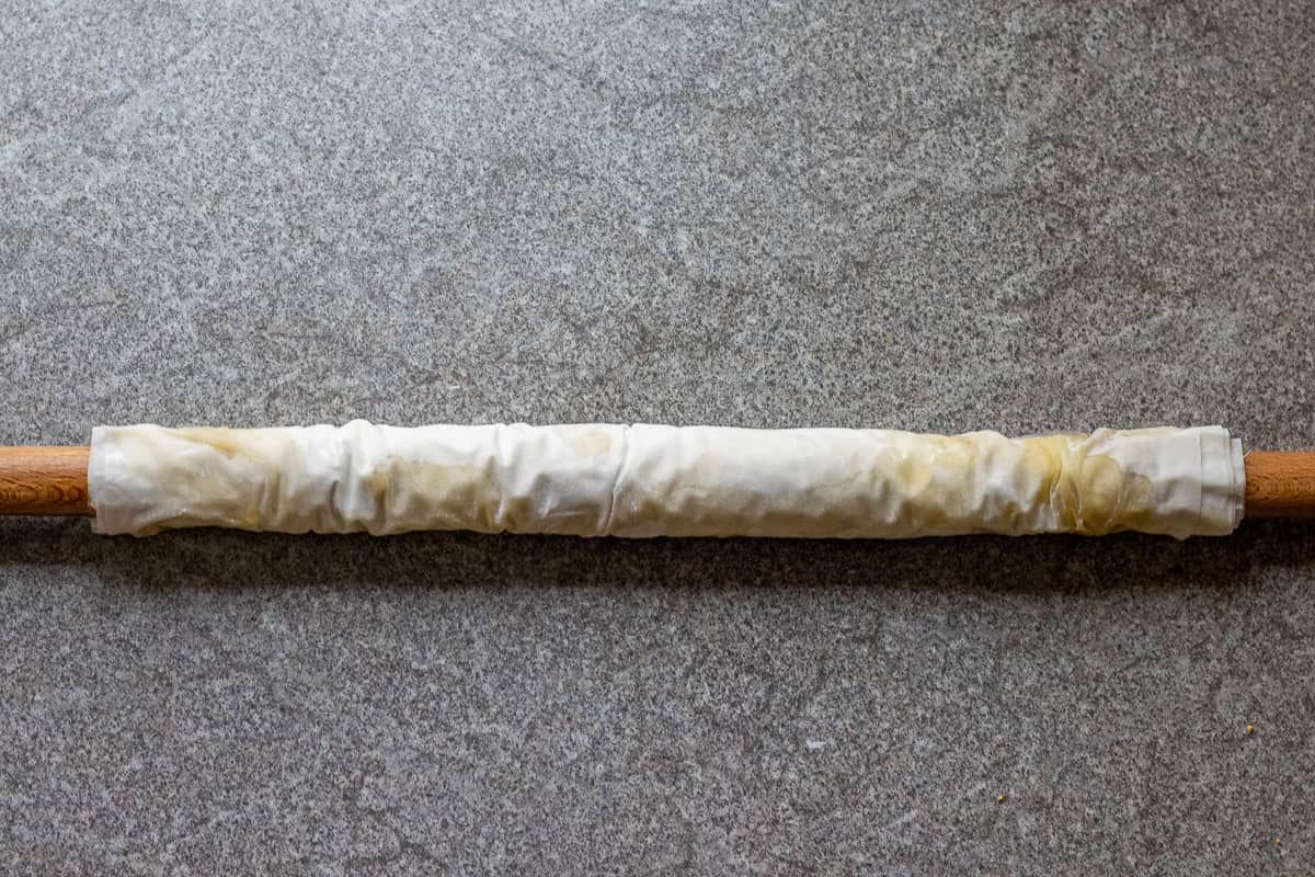 - Using your hands, gently press the ends towards the middle, tuck them in and remove the rolling pin. Place it on your baking dish and repeat with the remaining phyllo sheets.