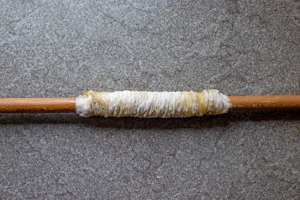 - Use clarified butter or ghee to avoid dark and burnt marks on top of the baklava rolls.
