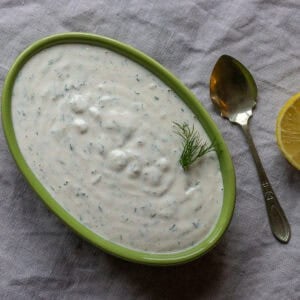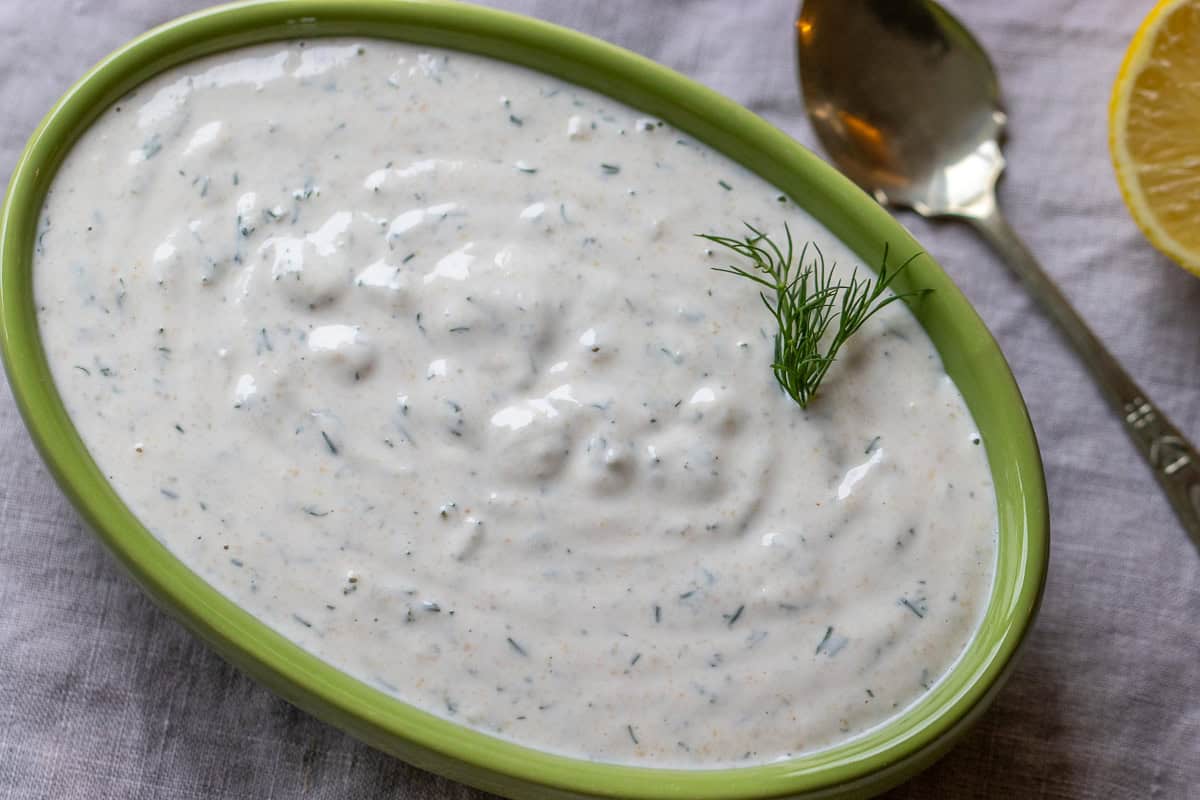 - Add chopped fresh dill leaves, transfer to a serving plate, and let the sauce sit in the refrigerator for at least 30 minutes before serving.