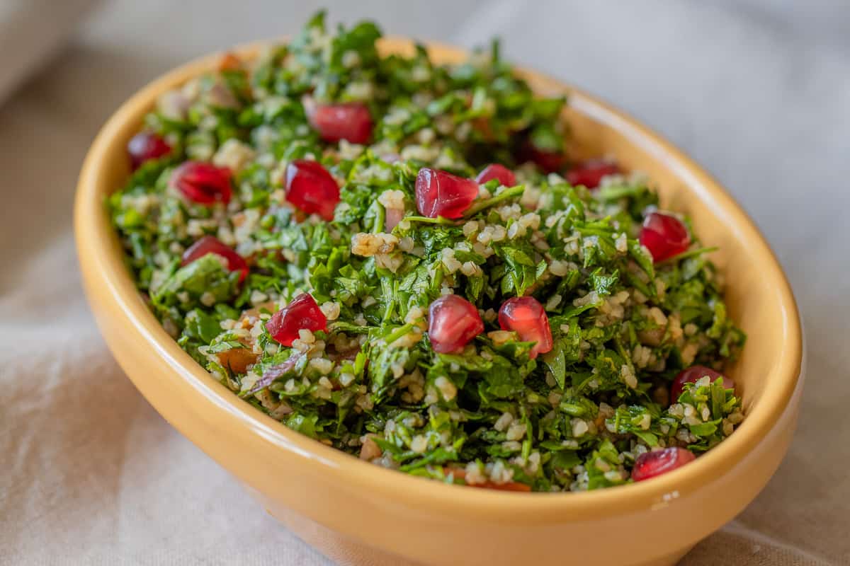 Add the bulgur, parsley, mint, pomegranate seeds, lemon juice, pomegranate molasses, olive oil, and salt to the bowl. Mix all together until nicely combined, taste, and then adjust the amount of seasoning to your taste.