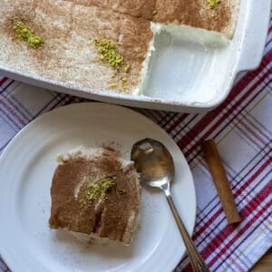 The dish is typically flavored with a hint of vanilla and/or mastic gum, and is served with cinnamon and ground pistachio on top.
