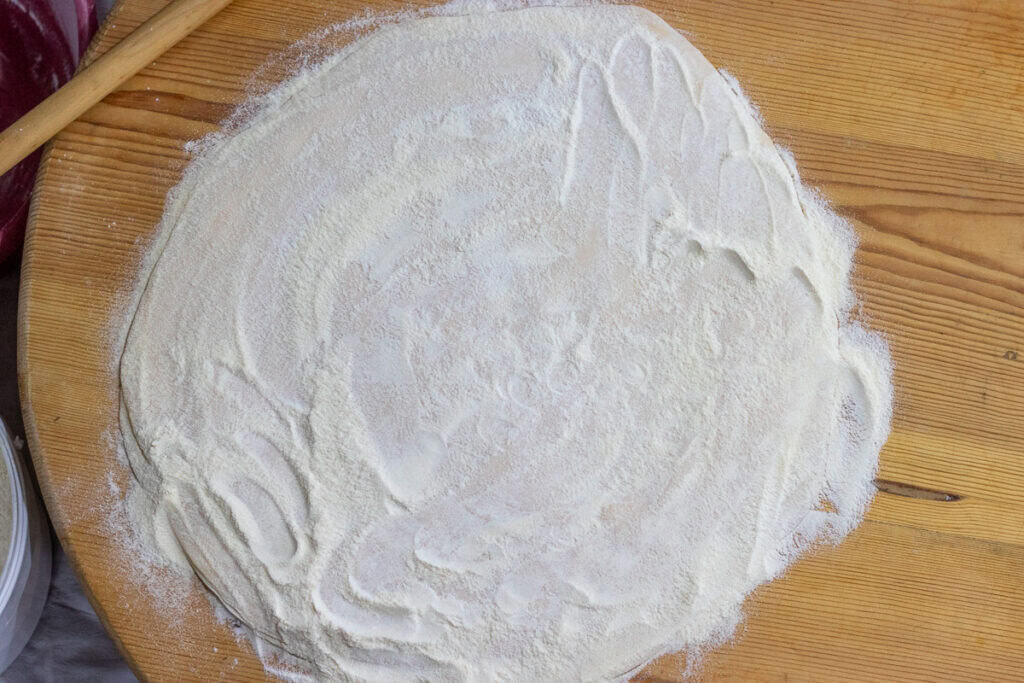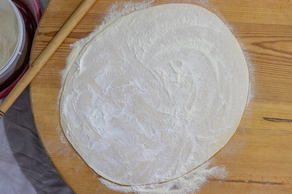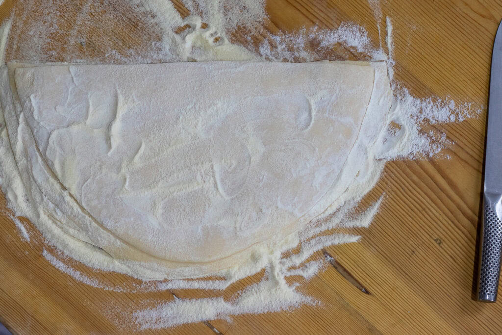 Roll the dough into thin sheets on a generously floured surface. Aim for a thickness of about 1-2 millimetres (about 1/16 inch), very thin but sturdy.